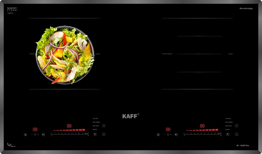 Bếp Từ KAFF KF-FL69II PLUS Inverter được tích hợp chức năng tự nhận diện vùng nấu, khi ta đặt nồi lên 1 trong 2 vùng nấu sau đó ấn nút khởi động bếp sau thời gian 1-2 giây bếp sẽ tự động tìm vùng nấu đã có nồi, ta chỉ việc điều chỉnh mức công suất to nhỏ theo ý muốn mà không phải thao tác chọn vùng nấu như bếp thông thường. Công nghệ Inverter được áp dụng trên bếp từ Kaff KF-FL69II PLUS có khả năng phản ứng thay đổi công suất theo điều khiển ngay tức thì, khi người dùng điều chỉnh tăng giảm nhiệt độ đun nấu, bếp điều chỉnh thay đổi tức thì về mức nhiệt độ mong muốn.