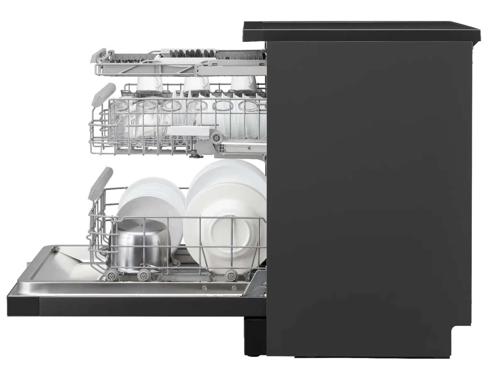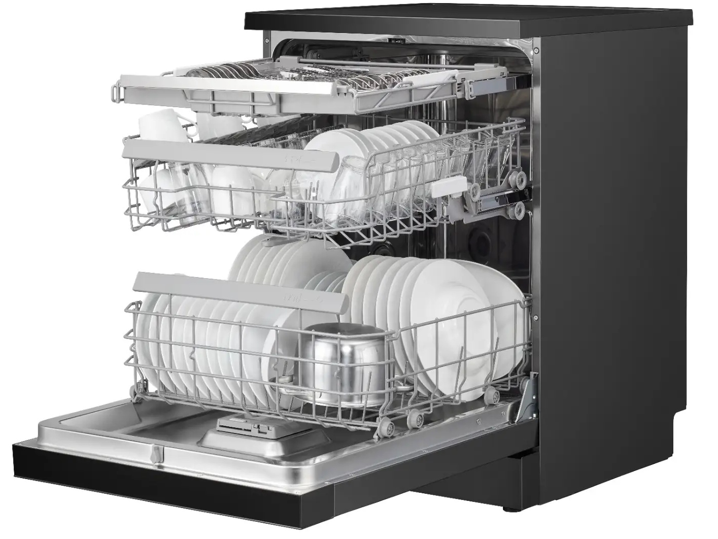 Với 3 cánh tay phun nước xoay 360° ở 3 tầng, hệ thống phun 720° bao phủ toàn bộ không gian buồng rửa, đảm bảo nước và chất tẩy thấm đều tới mọi góc khuất của chén đĩa, nồi chảo. Không còn tình trạng rửa sót hay còn dư mảnh thức ăn.