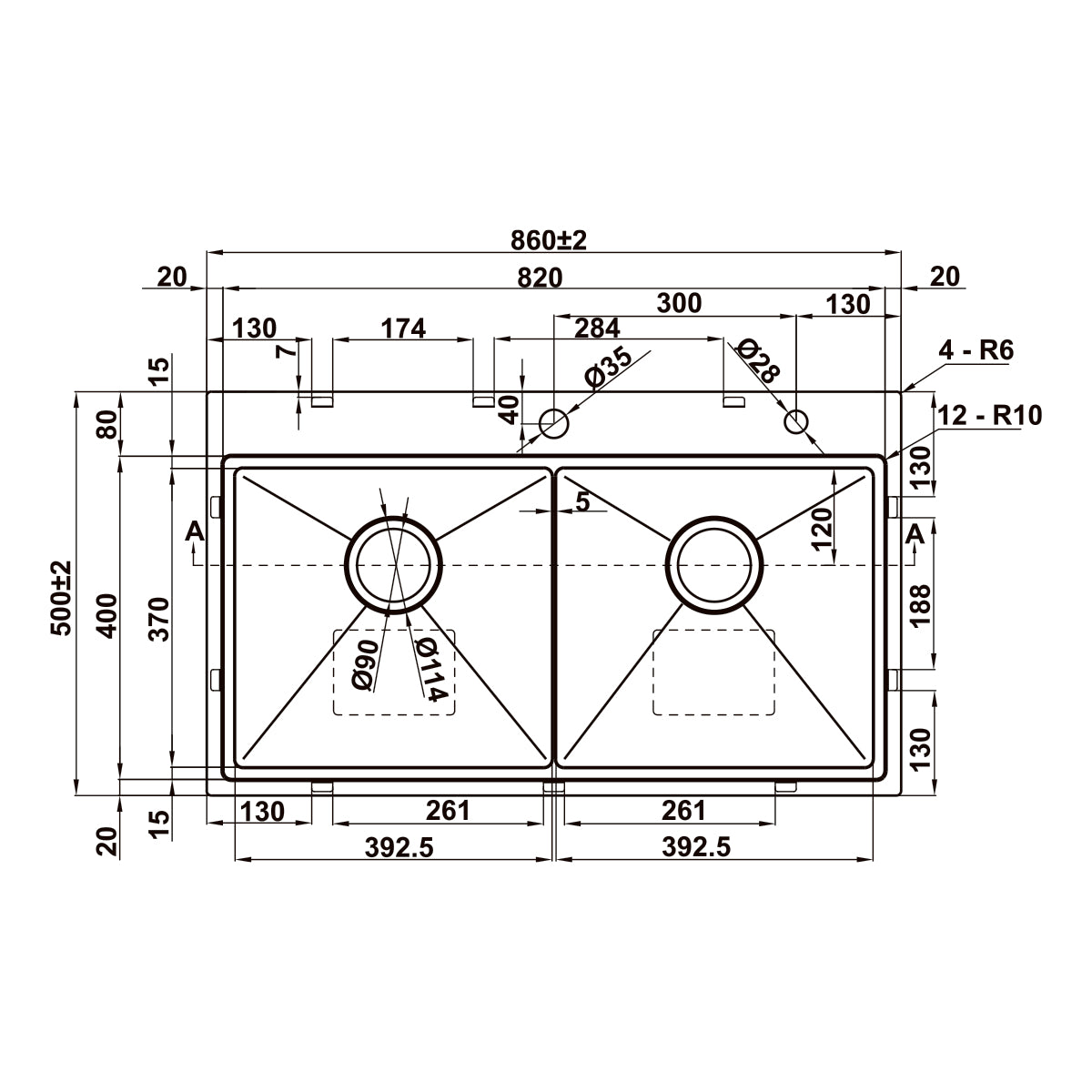 - Chậu đôi 2 hố, kích thước tổng thể 860 x 500 mm